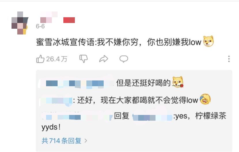 这次蜜雪冰城甜蜜主题曲出圈后,超过1000万播放量的B站主题曲下有个26.4万的高赞评论:我不嫌弃你穷,你也别嫌弃我low。