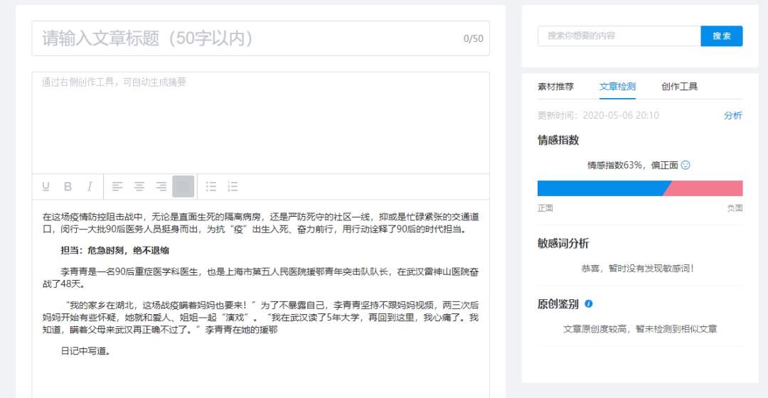 小张利用iNews的“智能编辑”功能进行抗疫相关内容的撰写,首先系统自动推荐了相关热点与素材,创作过程中可通过文章检测进行敏感词、情感、原创的鉴别,还可以通过自动摘要先生成摘要,提高生产效率。