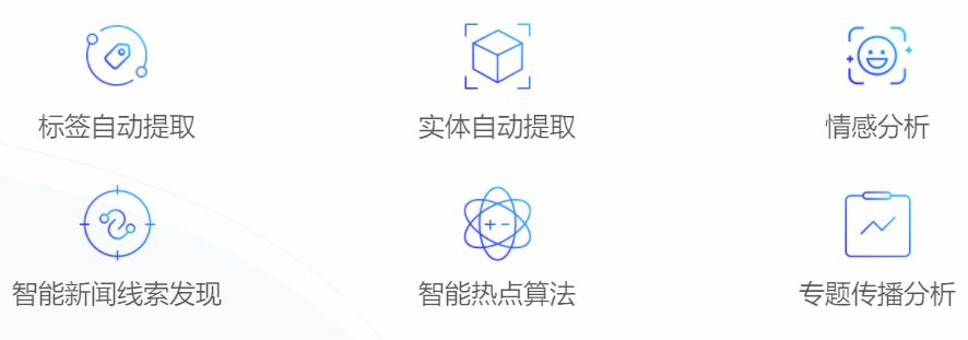 通过多种数据挖掘算法、语义分析算法、文本提取分析算法,快速梳理新闻分类、提取新闻要素、统计报道情况,帮助内容创作者快速掌握新闻事件全貌、了解时下热点、辨别新闻真实、捋清事件人物关系、深挖新闻线索。