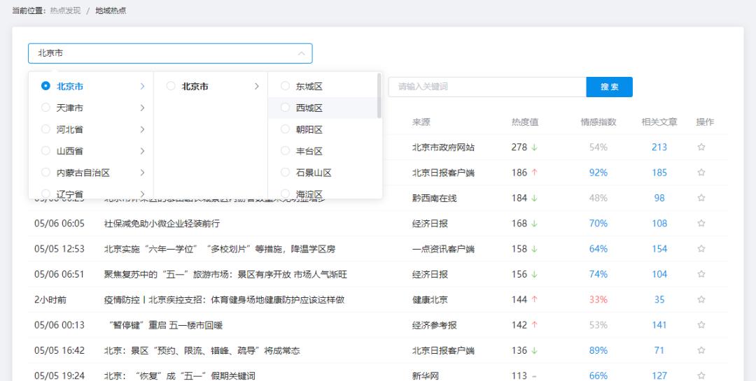 该功能将热点以三种分类——全网热点、分类热点、地域热点进行展示,同时给出热度上升或下降的变化趋势,为热点的判断提供可视化依据。
