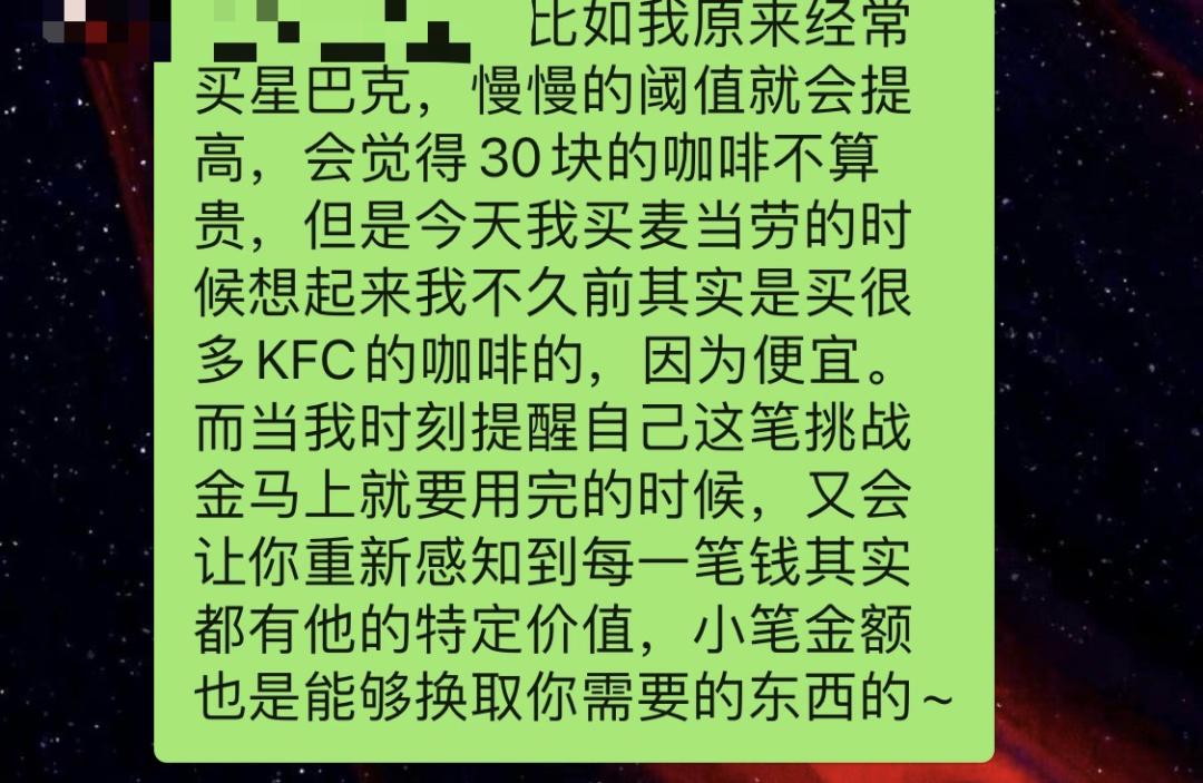 活动挑战者Miyami小姐 在某天早晨买麦当劳时突然意识到,这个活动让她重新获得了对金钱金额的感知。