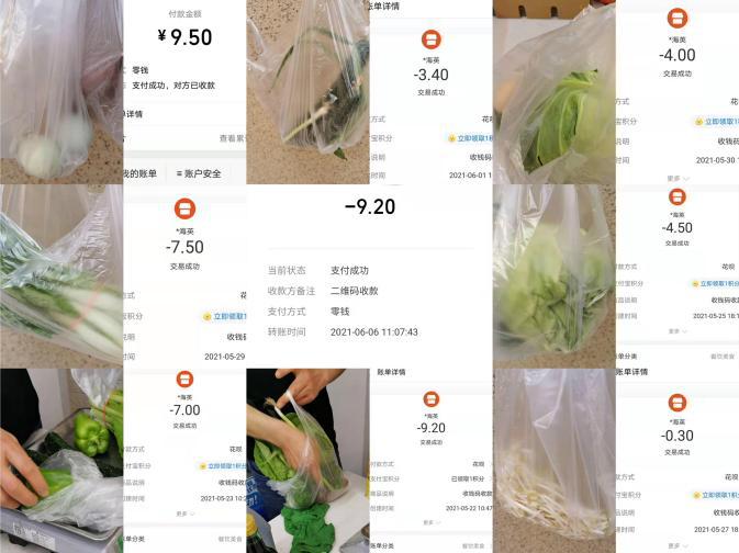开销最大的一次买菜记录是12.5人民币。因此,她可以在菜市场里解放天性,自由地挑选各种各样的“菜膳”。