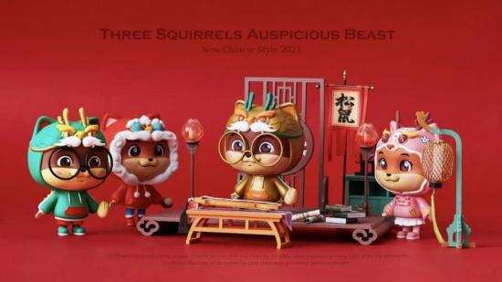 比如在“卷”得不行的盲盒营销中,三只松鼠就直接在自有的松鼠IP基础上,设计出了“小贱”、“小美”、“小酷”和“彩金”四款松鼠特色潮玩。既能“蹭”到盲盒的热度,也能顺带为品牌刷一波关注度。