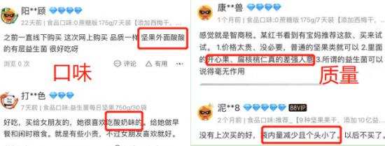 只不过,相较益生菌坚果宣扬的“养生功效”,消费者对于其口味和质量似乎更加看重。口味层面,益生菌坚果类似酸奶的口感获得了部分消费者的认可。质量层面,益生菌坚果则是和普通坚果一样,都需要面临消费者对“个头大小”的拷问。