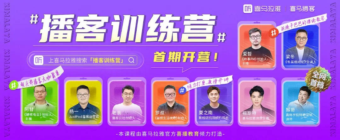 上周,喜马拉雅开通了全网首个“播客训练营”,培养创作者的多维能力,来自喜马拉雅平台的知名主播担任导师,通过直面播客制作、运营、商业化等环节中的痛点,输出一套相对系统化、标准化的流程与方法,以此来降低开播客的门槛。