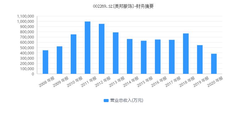 上市之后,美邦服饰的营业收入与业绩都曾辉煌过。其中,营业收入从上市时候的44.74亿元,最高增长到2011年的99.45亿元;但是从此之后,美邦服饰就走了下坡路,2012年的营业收入为95.10亿元,同比下降4.38%,此后虽有个别年份略有反弹,但营收总体处于下降趋势,2020年仅为38.19亿元。