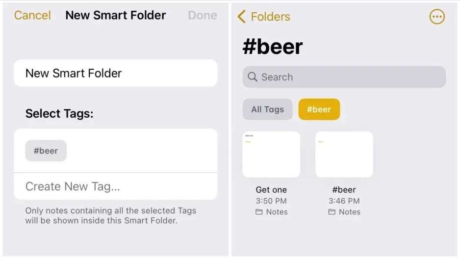 新版的笔记新增了标签(Tags)功能,你只需建立一个主题标签,即可根据单个或多个标签筛选备忘录。备忘录还可以依据标签,自动建立智能文件夹容纳你的笔记。