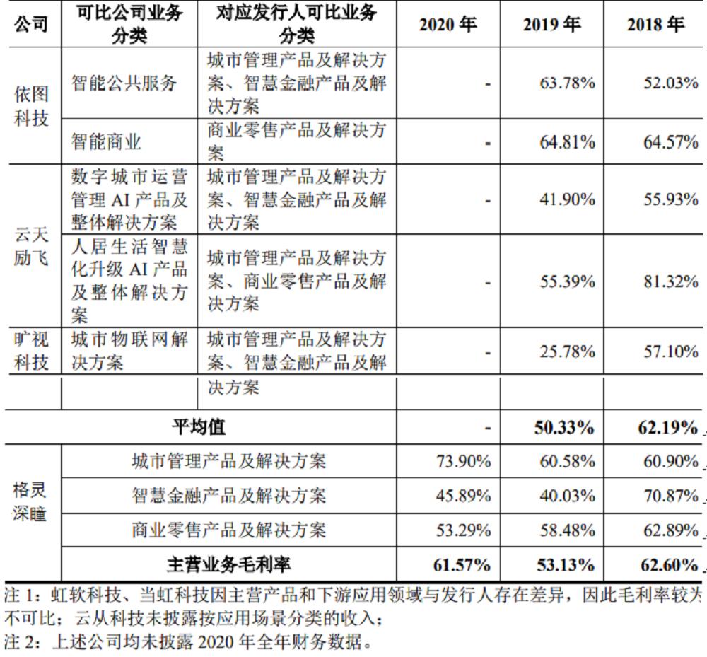 根据同行业可比公司已披露的公开信息,依图科技、云天励飞、旷视科技与格灵深瞳在上述业务领域有相似业务收入。从各公司平均值来看,其相似业务毛利率与格灵深瞳的主营毛利率接近。