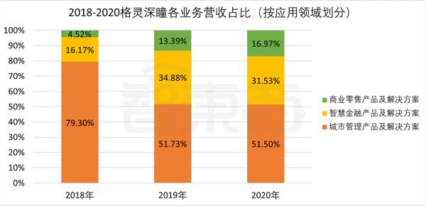 报告期内,公司主营业务收入来源于城市管理、智慧金融和商业零售三大应用领域的产品及解决方案。城市管理和智慧金融领域的销售收入合计占公司主营业务收入的比例分别为95.47%、86.61%和83.03%,是公司的主要收入来源。城市管理产品占比最高,一直在51%以上。商业零售产品及解决方案虽然占比最少,但是一直在增加,2018年商业零售方向业务收入占比仅为4.52%,2020年增长至16.97%。