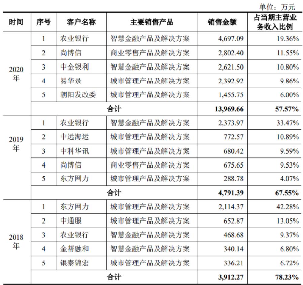 农业银行一直是格灵深瞳的前五大客户,尤其是在2019年和2020年销售金额占当期主营业务收入比例最高,分别为33.47%和19.36%。