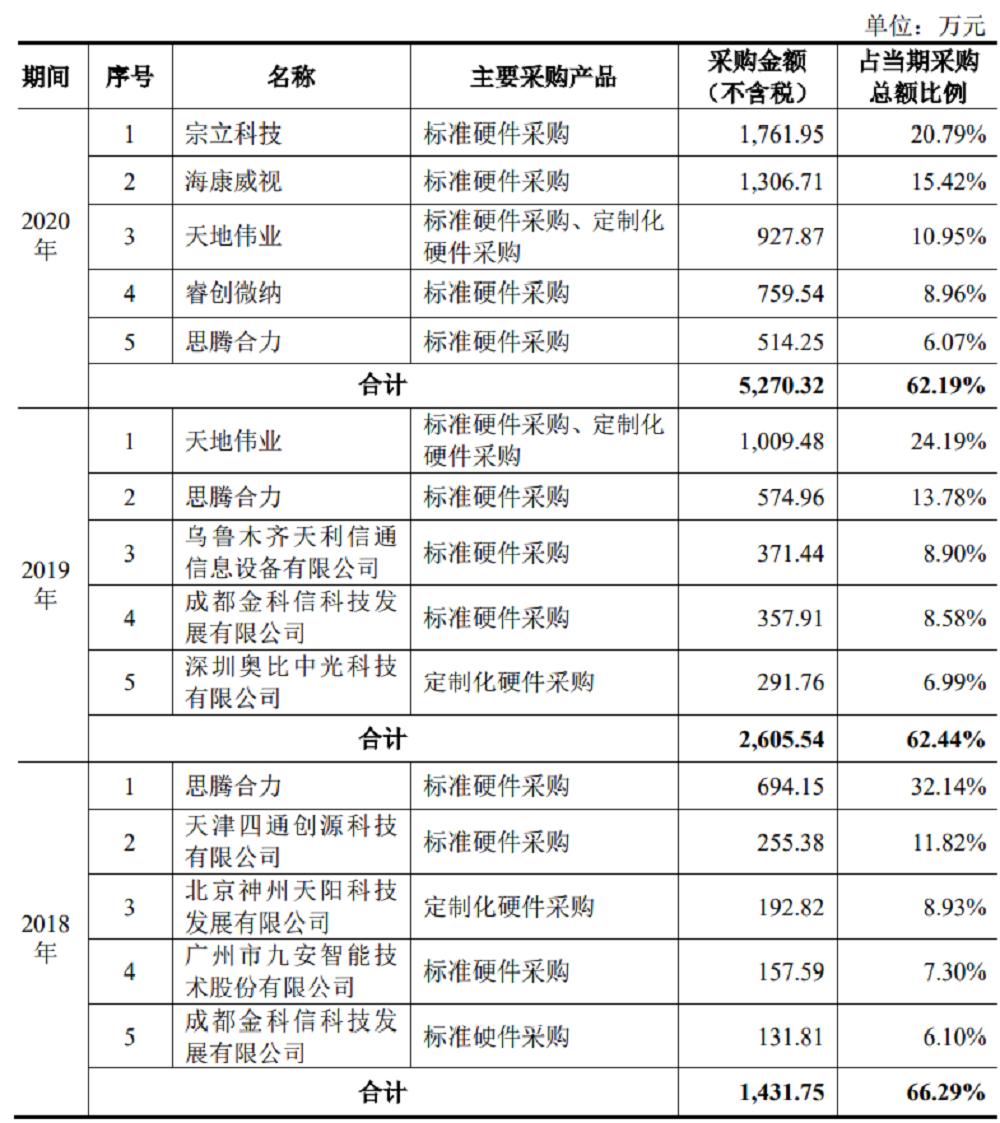 思腾合力一直是格灵深瞳的前5大供应商,主要供应标准硬件,不过从2018到2020年,采购思腾合力占当期采购金额比例逐渐降低。