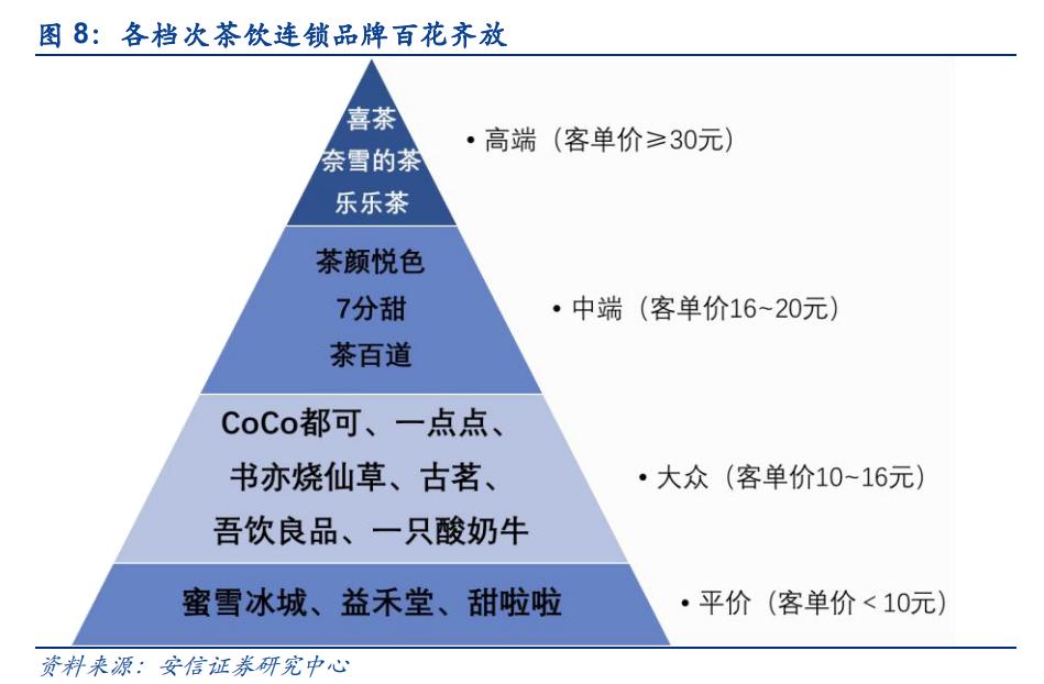 在刺猬公社(ID:ciweigongshe)看来,蜜雪冰城能如此广受欢迎,最主要的原因还在于它的定价远低于同类产品。由价格从高到低,安信证券在2021年的一份研报给茶饮产品分成了四档,其中,蜜雪冰城被排在最后一档,均价只有个位数。