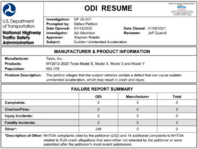 早在今年1月份,美国国家公路安全管理局(NHTSA)就公布了一份有关特斯拉“突然意外加速”的调查报告。这份评估了246例“突然意外加速”事故的报告不但洗清了特斯拉“意外加速”的清白,同时还驳回了一份对66.2万辆特斯拉汽车进行正式调查的请愿书。