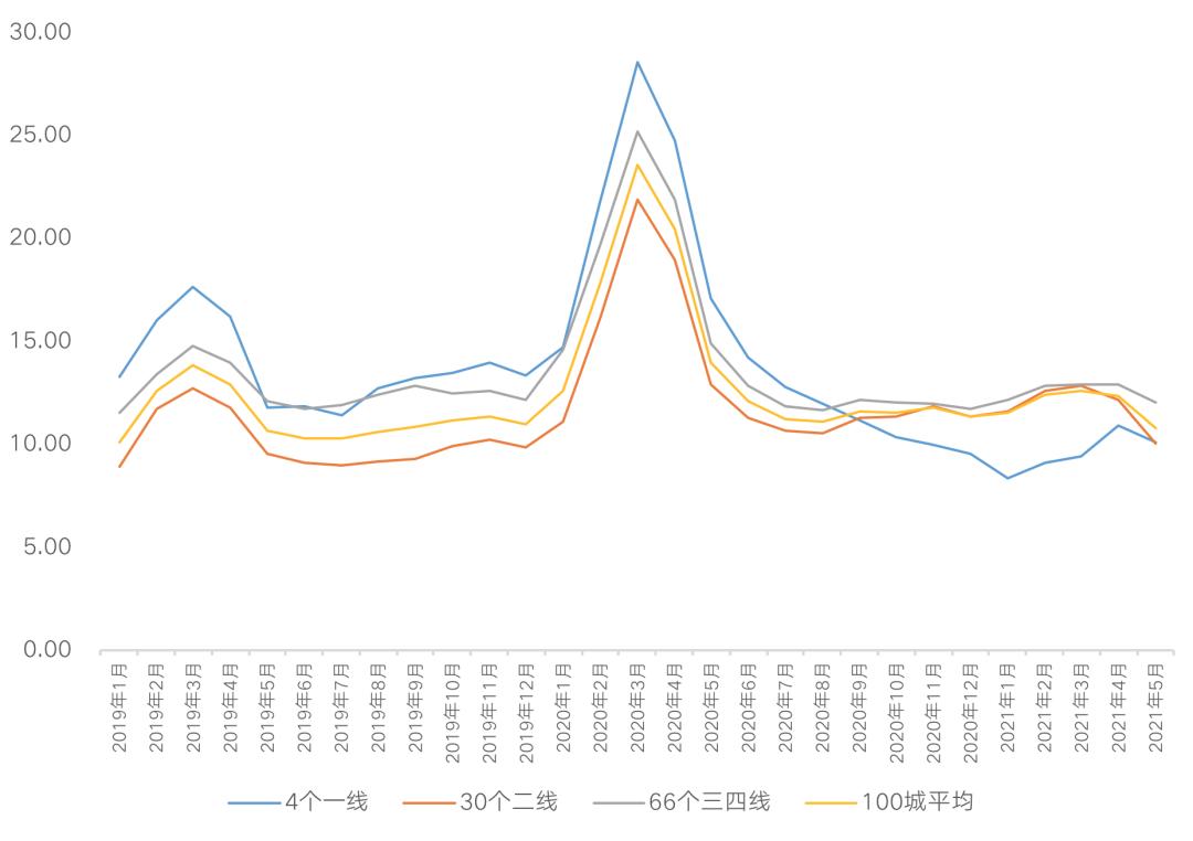 不同能级城市去化周期均保持降势。一二线去化周期与百城库存去化周期基本重合,持稳在10个月左右,整体库存风险基本可控;三四线降至11.99个月,略高于百城平均。