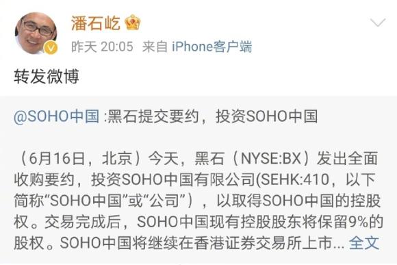 6月16日,SOHO中国(00410.HK)发布公告称,黑石集团发出全面收购要约,以取得SOHO中国的控制权。交易完成后,SOHO中国董事长潘石屹和执行董事张欣仅只保留9%股份,并将退出董事会。