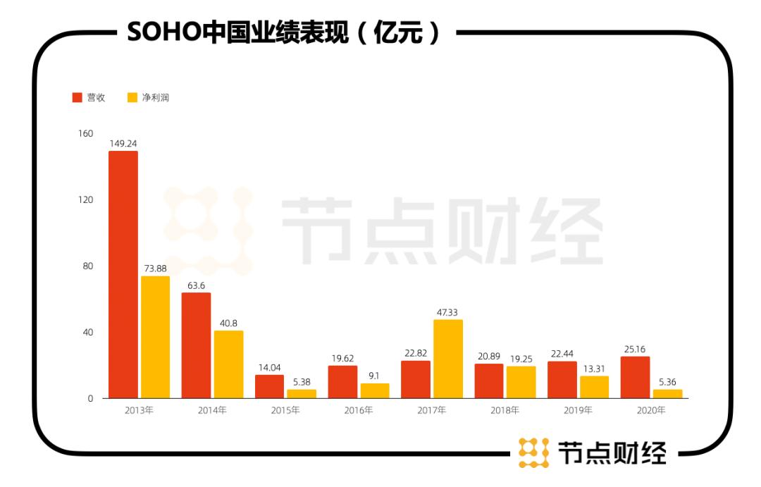 据WIND数据显示,2013年至2020年,SOHO中国营收从149.24亿元下滑至25.16亿元,净利润从73.88亿元下滑至5.36亿元。如果不是卖掉了很多资产,SOHO中国的业绩恐怕更难看。