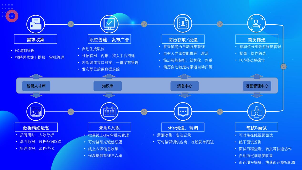 整个招聘流程拆解下来,大致就是包含了这7个关键节点的流程——从收集需求、创建职位,到发布广告、收取简历,拿到简历后,HR会去做筛选,并安排笔试面试,然后谈offer、进行背调,最后选择是否录用。