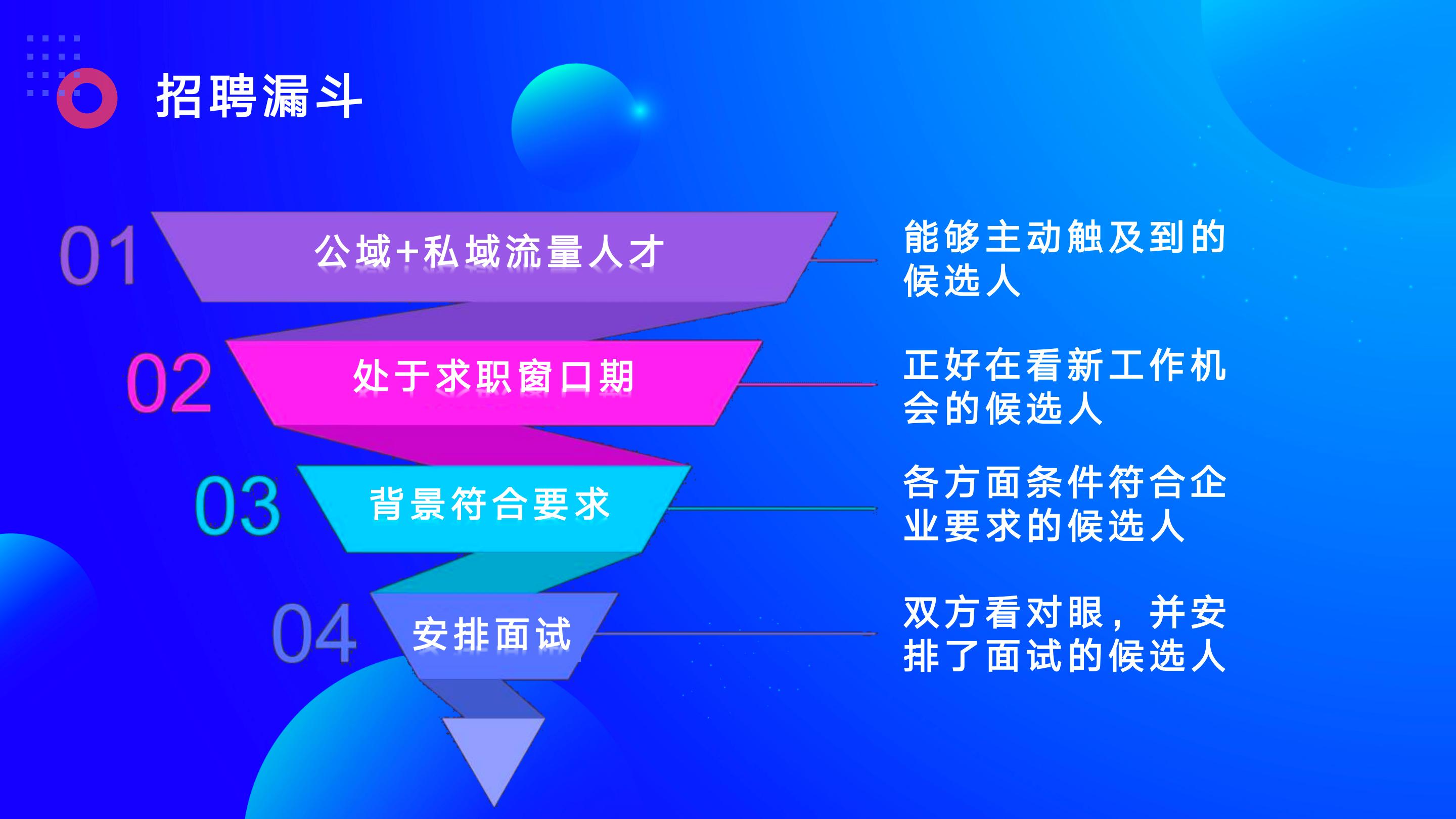 第一层,是公域+私域流量的人才,也就是我们能够主动/被动触及到的所有候选人。是整个漏斗最开始的input;