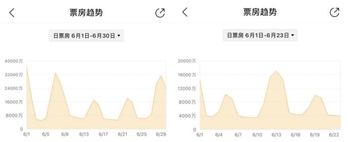 今年三四月份的时候,我们曾多次聊到过冷档期的现象。在春节档余力基本发挥完全之后,整个三四月市场一度降至冰点。三四月份大盘均为25亿,这还是在有清明档的加持下。五月份,市场有了一个小幅提升,达到了48亿。没想到六月份,颓势继续来临,到现在甚至才刚刚16亿,比三四月份大盘还要低。