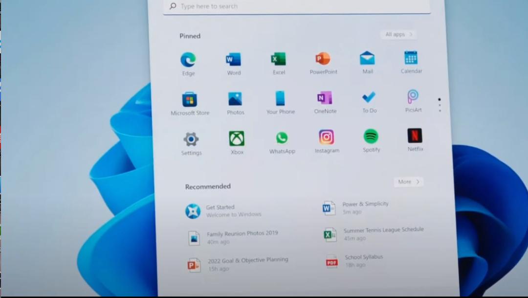 打开开始菜单后,可以看到传统的磁铁设计遭到取消,取而代之的简化的网格布局。现在,开始菜单的顶部区域是快捷搜索栏,第二排是应用列表,用户可以随时将应用固定在第二排上,第三排会显示推荐文件和应用程序,而电源选项现在位于右下角,带有关闭、睡眠或重新启动系统等选项。
