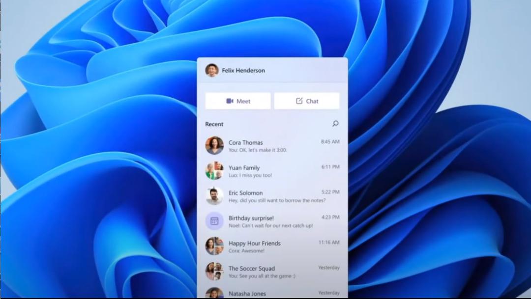 令人惊讶的是,微软在Windows 11中内置了Microsoft Teams。据悉,Microsoft Teams是一款微软出品的基于聊天功能的智能团队协作工具。今年6月23日,微软宣布推出消费者版本的Teams,支持用户与家人和朋友进行日常交流,大有取代Skype的意思。