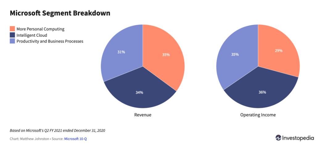 现在的Windows,已经不再是微软的最大营收来源。在销售旺季的去年第四季度,Windows所在的“更多个人计算”部门(Windows、Xbox、Surface等业务)目前的营收占比是35%,与“智慧云”(Azure、SQL服务器、GitHub等云服务)部门营收基本持平。但运营收入的贡献占比却明显低于“智慧云”和“生产力与商业流程”部门(Office、Dynamics和LinkedIn等业务)。