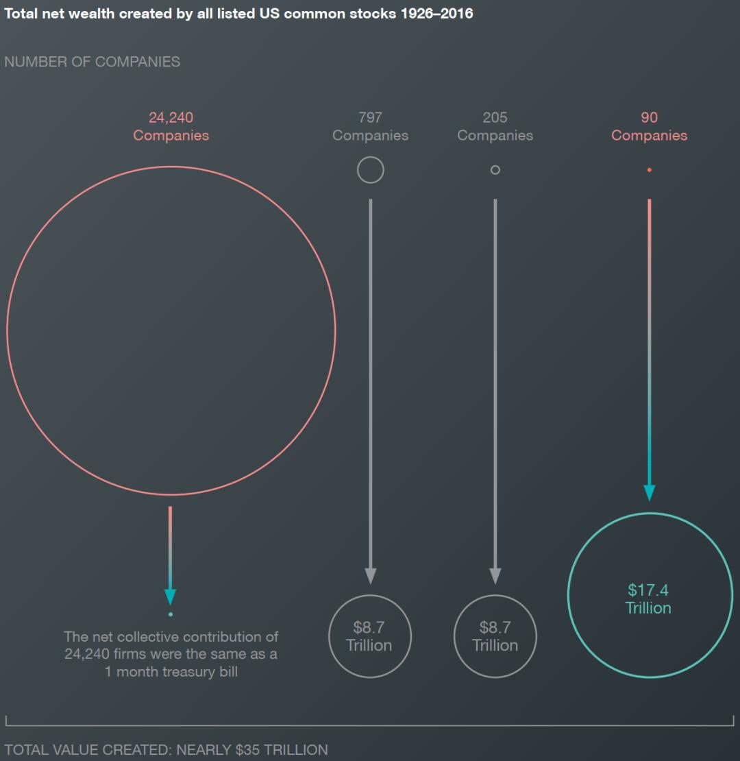 但是,除了表现最好的1,092家公司外,占比37.8%的9,579家公司创造了约6万亿美元的股票收益,却有占比57.9%的14,661家公司产生了约6万亿美元的股票损失,抵消之后,只有4%的核心企业股票——即那1092家公司推动了近一百年里美国股市的全部净财富创造,其中90家核心公司的贡献超过一半。