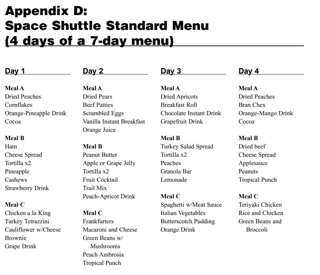 ■ 按天划分的太空食物,像极了定制化打包出售的代餐 ,来源:NASA 太空食品和营养科教指南