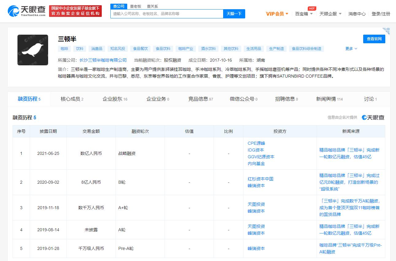 据天眼查消息,6月25日,三顿半已完成新一轮数亿元融资,中信产业基金领投,IDG、GGV 和内向基金跟投,投后估值为45亿人民币,穆棉资本继续担任独家财务顾问。