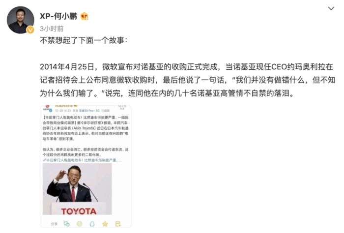 因为这番言论,何小鹏将丰田类比为诺基亚,暗喻丰田等传统燃油汽车厂商将错失智能汽车时代。