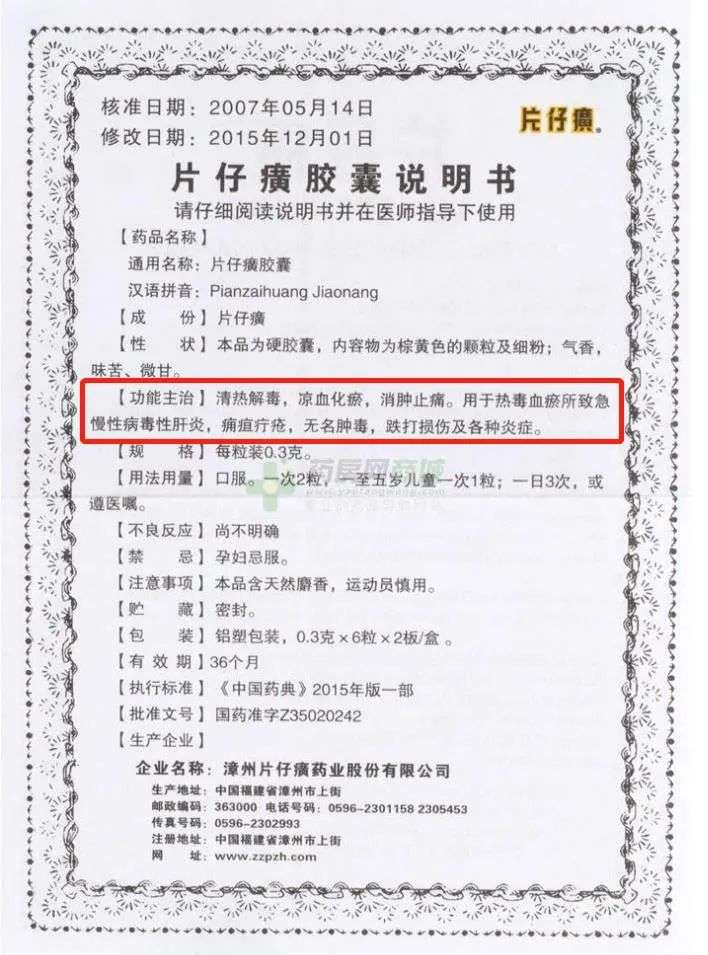 片仔癀的说明书上【功能主治】一项是这样写的:清热解毒,凉血化瘀,消肿止痛。用于热毒血瘀所致急慢性病毒性肝炎,痈疽疔疮,无名肿毒,跌打损伤及各种炎症。主治的病种非常广,但也有“急慢性病毒性肝炎”这项非常具体的病种。