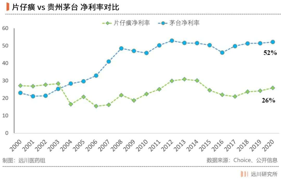 当然,跟真茅天子相比,片仔癀也有缺陷,就是其原材料是真稀缺,提价仅能消化原材料上涨,导致片仔癀的净利润率一直在20%左右浮动。不像茅台的原材料就是高粱和水,其净利润率在2000年左右的时候低于片仔癀,但通过持续提价,净利率一路走高。