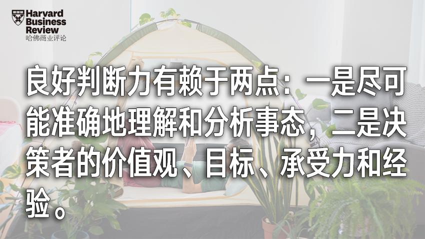 良好判断力有赖于两点:一是尽可能准确地理解和分析事态,二是决策者的价值观、目标、承受力和经验。一位资深高管曾告诉我:“我不会只因为头脑告诉我某事是正确的就去做,我还必须能够感受到它。如果感受不到,我就必须让头脑和感觉取得一致。”