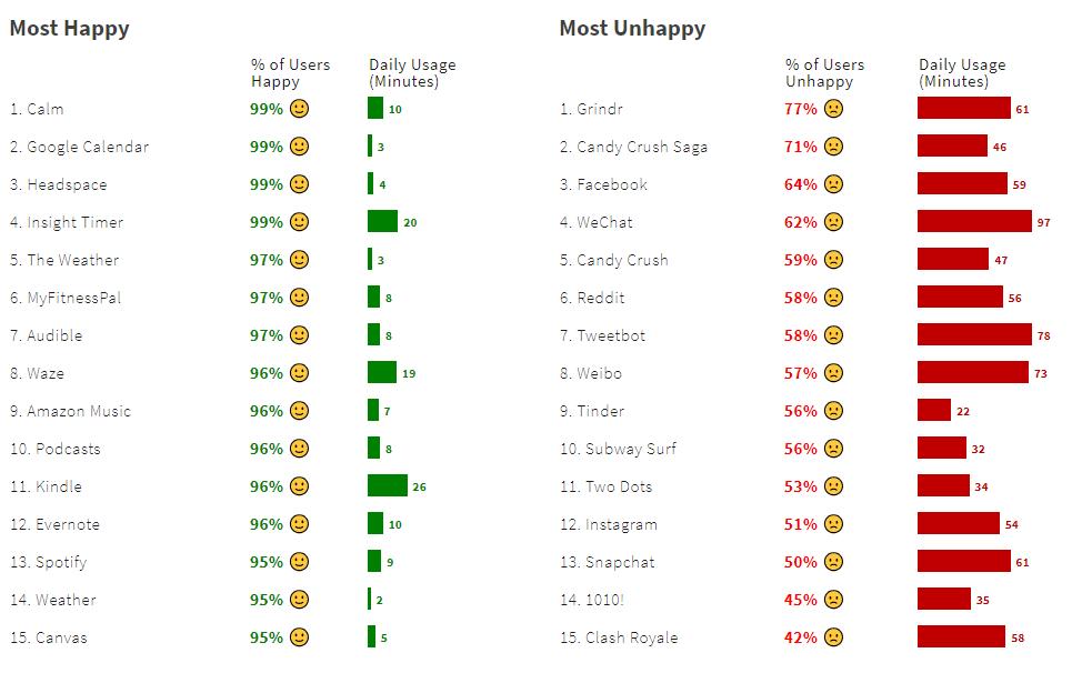 尽管如此,这些约会软件基本上都是同一套操作:滑人、匹配、初感兴趣,最后失望。这种循环也让Tinder和Grindr排在了“最有可能让用户感到悲伤的应用程序”前10名。