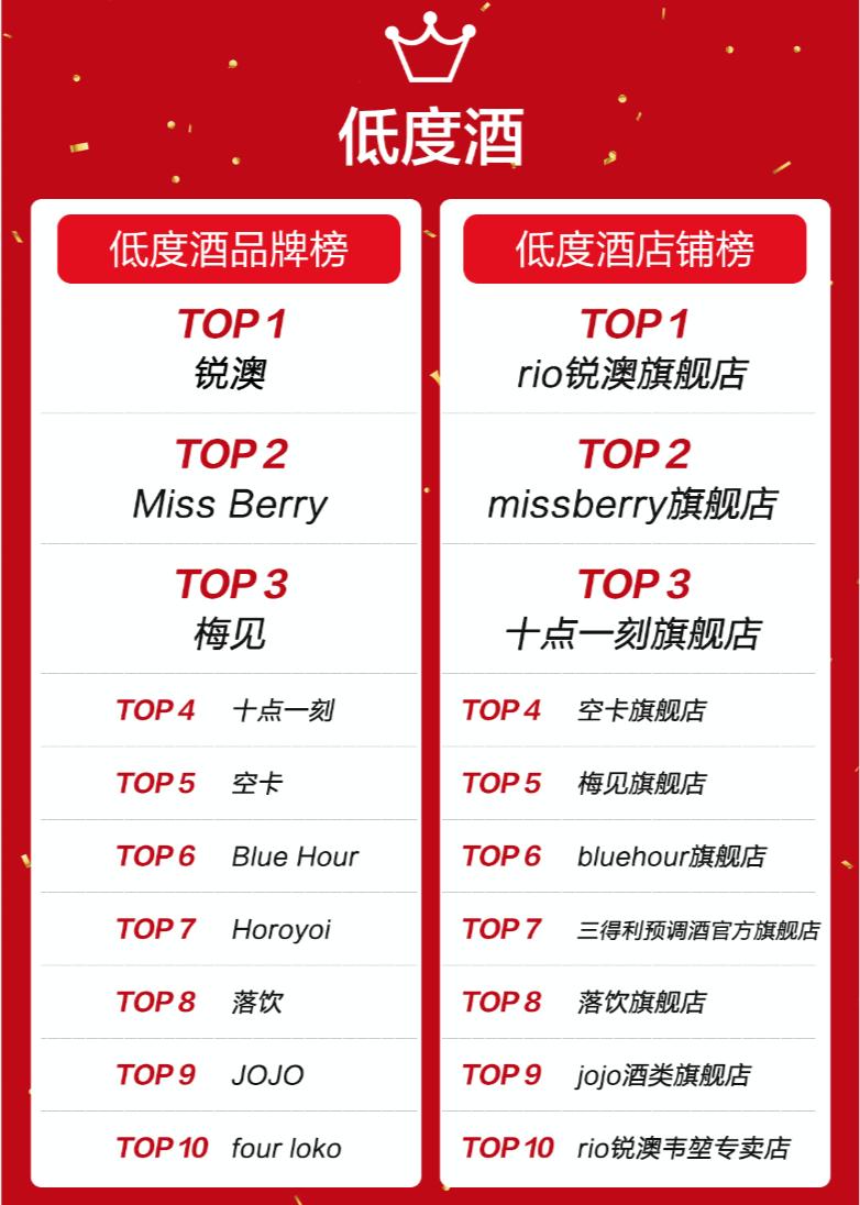 低度酒品类保持高速增长的同时,涌现了大量新锐品牌,前十名中有6席新品牌。硬苏打创新品牌、茶果酒品牌、梅酒品牌和国内预调酒大牌争奇斗艳,深受年轻消费者喜爱。