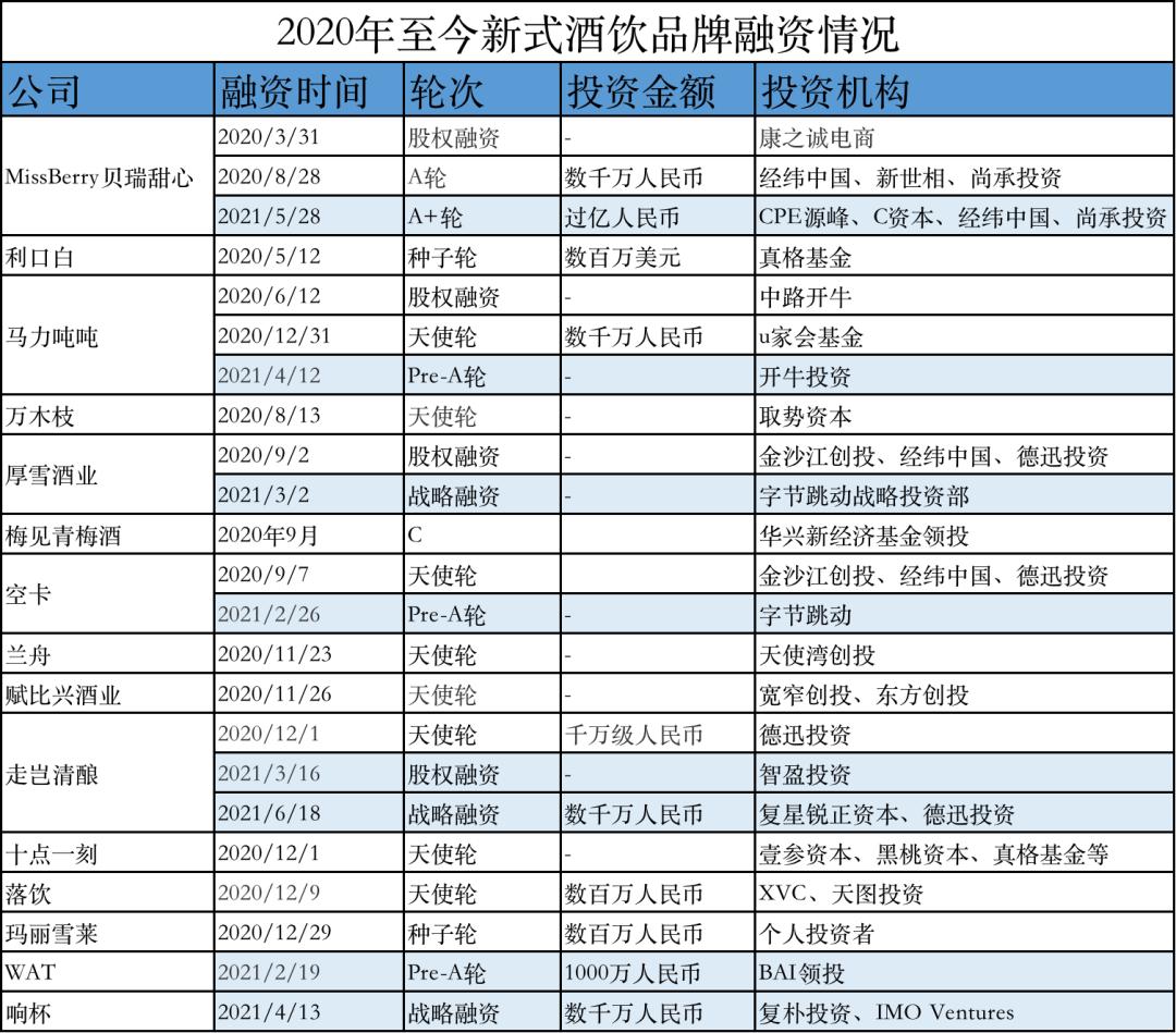 不完全统计,从2016年至今,新式酒饮行业内至少15个品牌获得融资,其中冰青完成三轮融资。仅2020年以后,十几家新式酒饮公司已完成23轮融资。其中,MissBerry 贝瑞甜心12个月融资三轮,兰舟、落饮、十点一刻等完成天使轮融资,背后不乏经纬中国、红衫资本、金沙江创投、天使湾创投等投资机构。