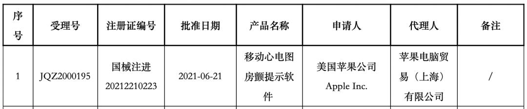 说到苹果表,最近,国家药品监督管理局发布医疗器械批准证明文件(进口)待领取信息,其中第一项就是苹果的移动心电图房颤提示软件。