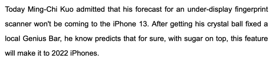 郭明錤表示,屏下指纹今年没有啦,不过估计会出现在2022年。
