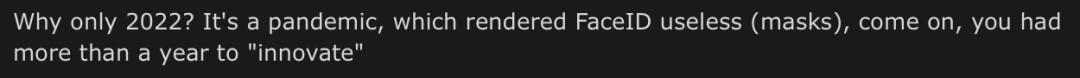 「为什么是2022?疫情(口罩)让Face ID毫无用处,你们已经有超过一年时间去『创新』了,好伐。」