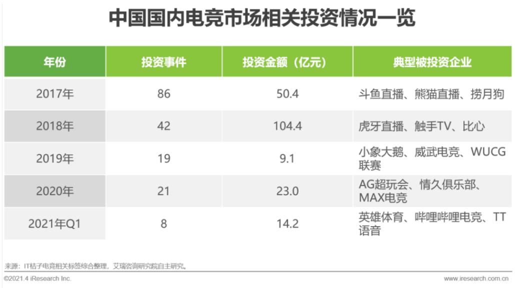 有了政策加码,电竞也逐渐走上了规范与标准化的道路,电竞市场的投资热情又一次被点燃,2021年第一季度,以TT体育为代表的8个投资事件,已经贡献了14.2亿元投资金额,远超2019年全年9.1亿元的投资低谷期水平。
