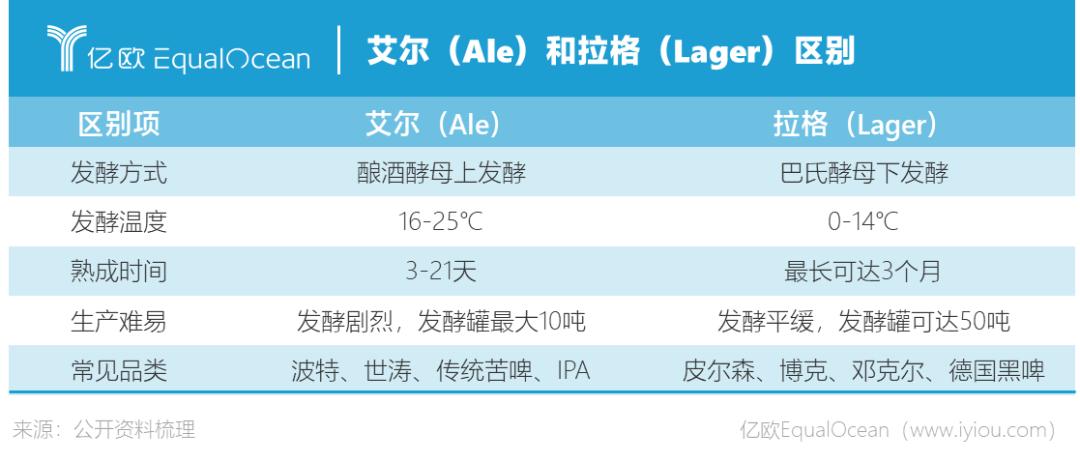 艾尔酵母在桶顶部发酵,温度略高,发酵时间短,更突出酵母的风味,约占啤酒种类80%以上,精酿啤酒主要就是艾尔;拉格酵母在桶底部发酵,温度略低,发酵时间长,更强调麦芽的风味,工业啤酒大都是拉格。