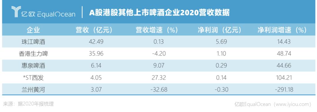 除了五大巨头之外,珠江啤酒(二股东百威英博)、惠泉啤酒、*ST西发等其他上市啤酒企业,在2020年也实现了逆势上涨。珠江啤酒的净利润更是五巨头中排行最末的燕京啤酒的近3倍,二级市场中其市值已经超过燕京啤酒。