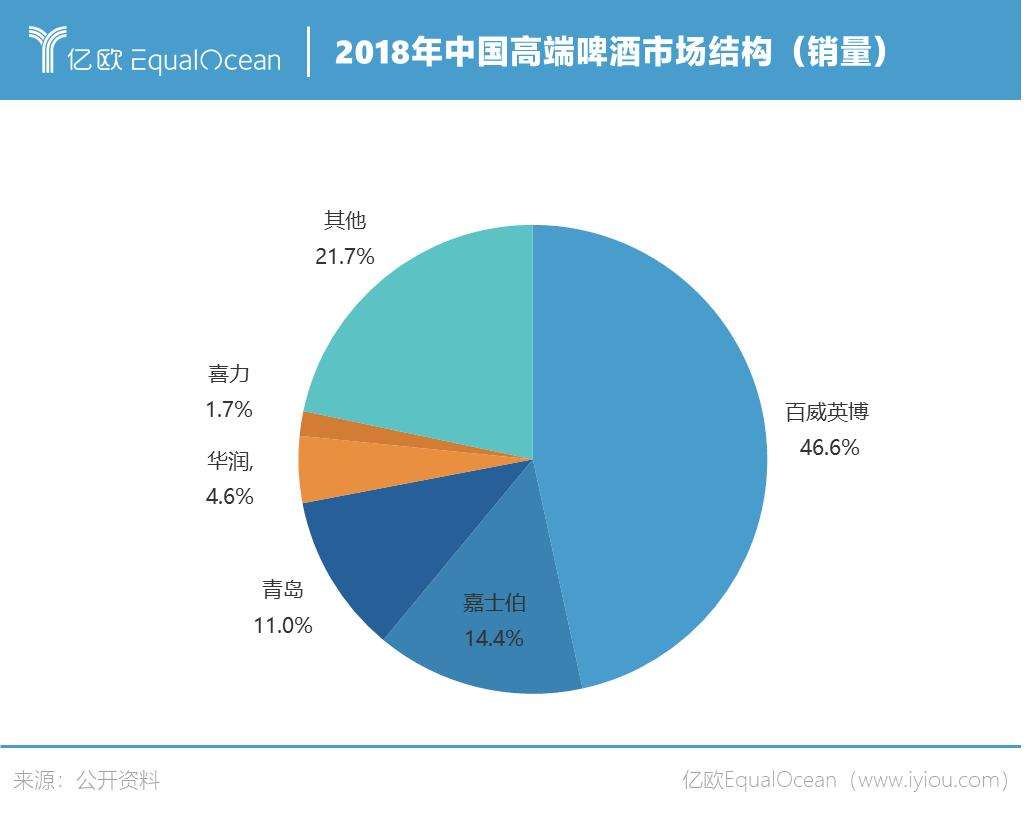 目前国内的高端啤酒市场中,国际巨头百威英博仍大幅领先,本土品牌主要靠青岛啤酒和华润啤酒。据统计,2018年百威英博、嘉士伯、青岛、华润、喜力在高端啤酒市场的市占率分别为46.6%、14.4%、11.0%、4.6%和1.7%。