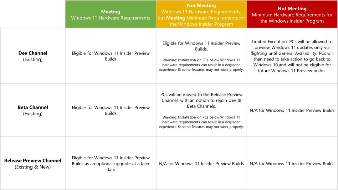 而已经是 Windows 预览体验成员的用户可查看下表以了解你的 PC 是否有资格使用 Windows 11 Insider Preview 版本,并可在该网址下载最新的 Windows Insider SDK:https://www.microsoft.com/en-us/software-download/windowsinsiderpreviewSDK。