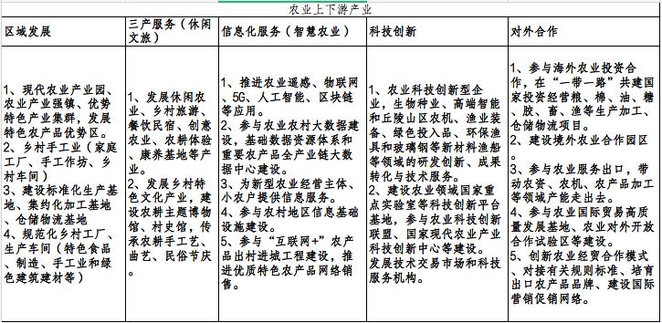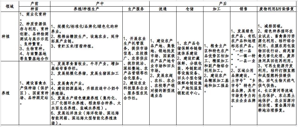 指引中提出13个投资领域,按照农业生产(产前-产中-产后)、农业上下游、农村发展三个板块进行重新归类。简述如下: