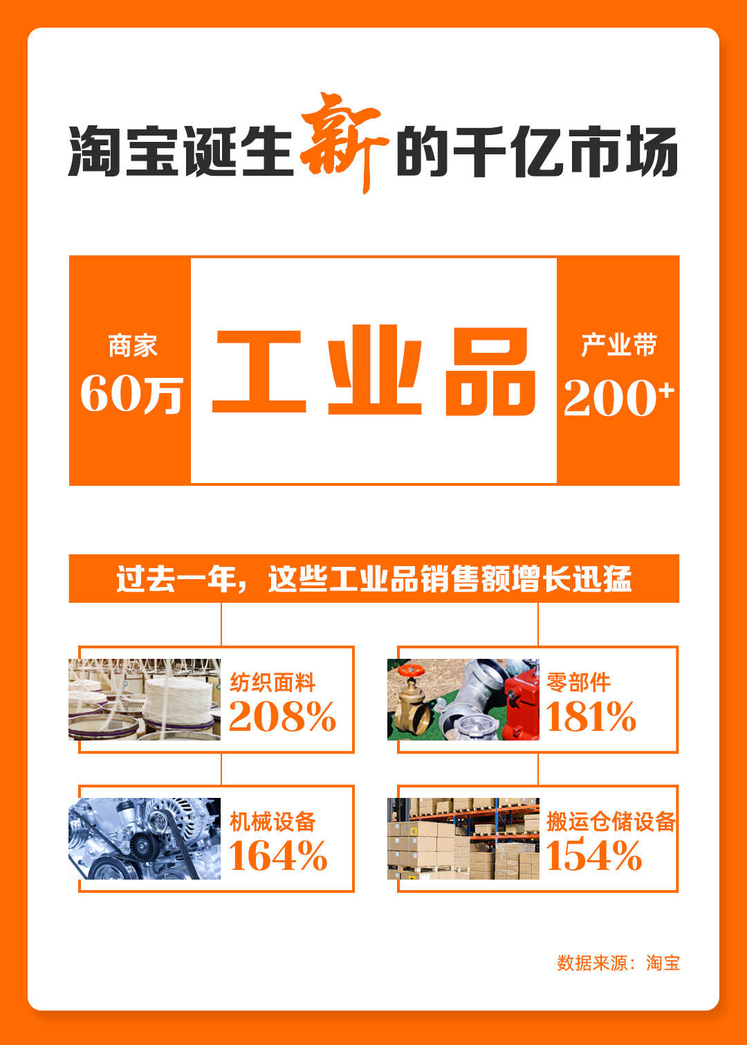 数据显示,过去一年,淘宝上有多类工业品销售额增长迅猛。其中,纺织面料同比增长208%,零部件同比增长181%,机械设备同比增长164%,搬运仓储设备同比增长 154%,橡塑材料及制品同比增长112%。