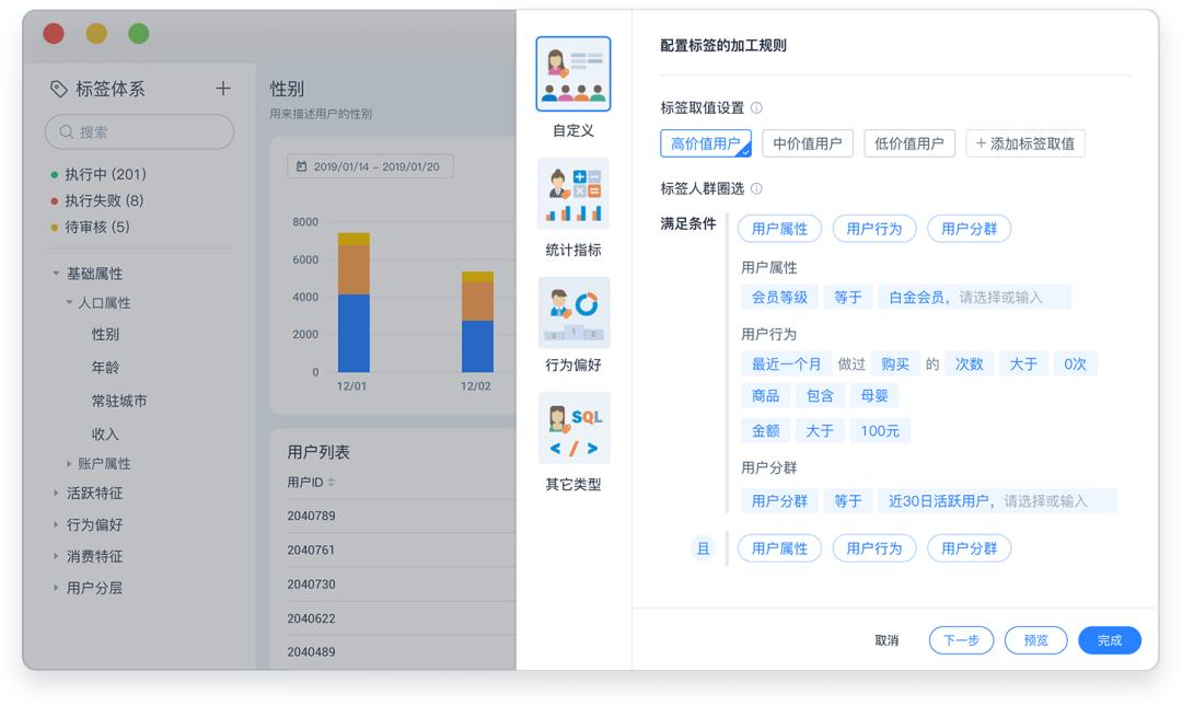 能够自由的进行标签管理和维护,根据业务逻辑中的用户生命周期来匹配用户标签从创建、加工、维护到下线的整个环节,紧密贴合业务本质,而非生成一堆数据。
