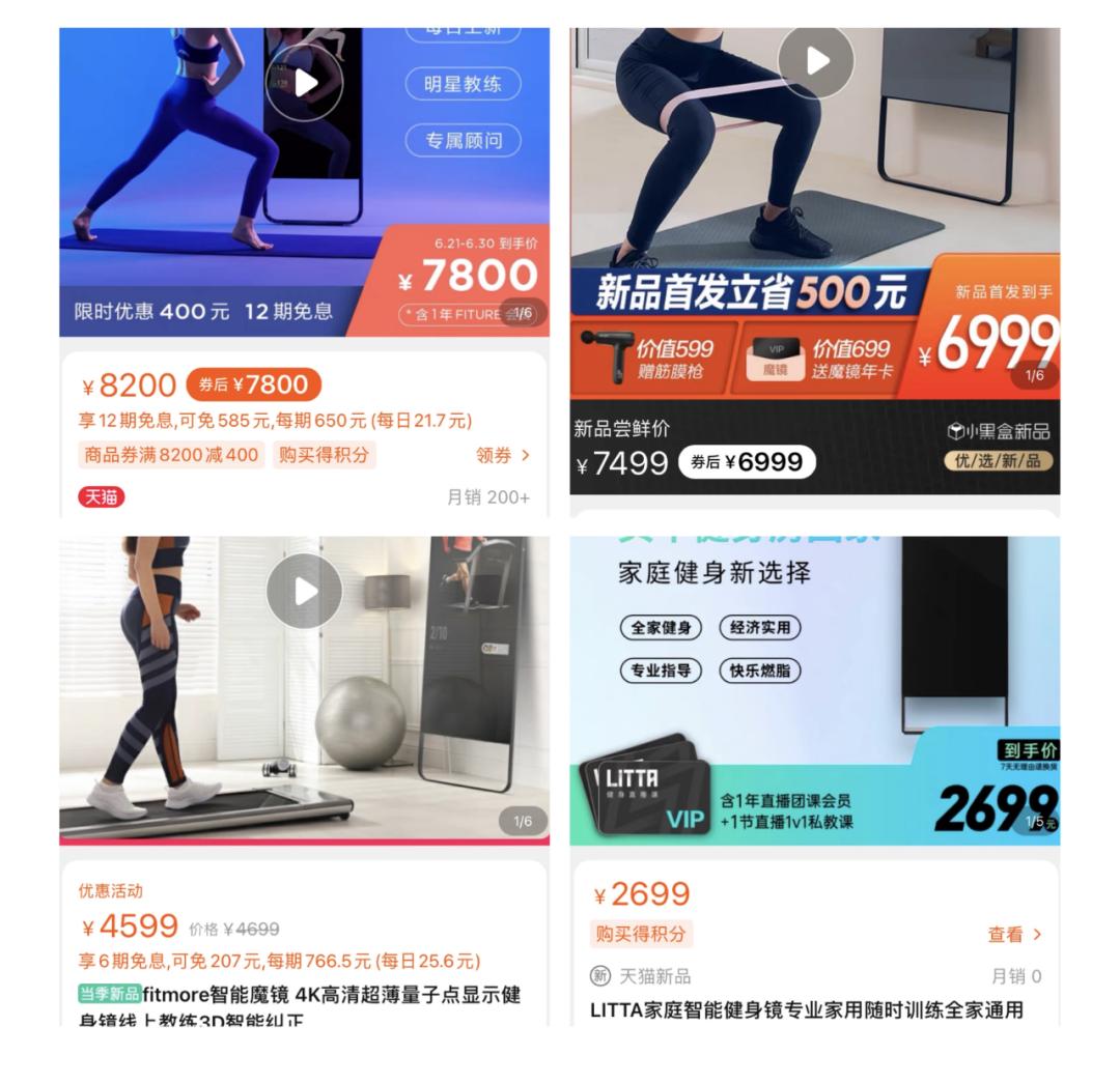从产品售价来看,FITURE健身镜卖得最贵,在天猫、京东旗舰店的售价达到8200元(券后7800元);亿健健身镜次之,售价为6999元;FITMORE的起步价为3999元;而乐刻发布的LITTA MIRROR 售价仅为2699元,这已经是目前国产健身镜最低售价。