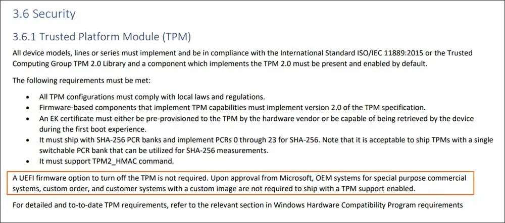 问题是,很多老设备和廉价设备,不是没有安装 TPM 就是没有启用它。虽然微软在近日发布的一份文档中暗示,经过微软批准的 OEM 厂商和特殊定制订单可以选择不启用 TPM,但没人知道这里包不包括个人电脑市场。