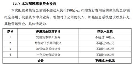 中信证券公告曾提到,配股募资280亿元的主要用途有以下四项:不超过190亿元发展资本中介业务、不超过50亿元增加对子公司的投入、不超过30亿元加强信息系统建设以及不超过10亿元补充其他营运资金。